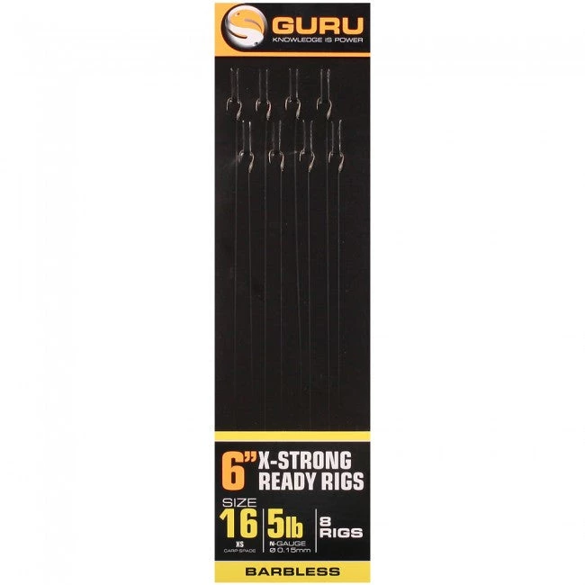 XS spade end barbless hooks. Perfect hook size to line strength ratio. Tied to Guru N-Gauge line. Perfectly tied spade end hook. Figure of eight loop for easy connection.