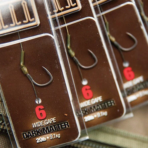 A lot of thought has gone into this set-up, with Korda’s Neil Spooner having used it for years to perfect it, and it is his ‘take anywhere rig’ that he has used to great effect to land carp of all different sizes! The Wide Gape hook pattern is incredible in terms of it’s hooking potential anyway, but has been enhanced even more by the addition of a short length of shrink tube that helps to make the hook turn even more aggressively when in a carp’s mouth, and a small piece of silicon tubing on the shank of the hook ensures the hair comes off at the optimum point. The rig comes supplied with free extender hair stops, meaning that it is compatible with all different sized baits, and allows you to effectively change the length of the hair and separation between your bait and hook simply by using a different type of bait stop. It is tied on Dark Matter braid which is heavy and sinks incredibly well, meaning that it hugs the contours of the lake bed – although being a braid it can help avoid any chance of a tangle if you add a PVA bag or stringer when you cast out. Different breaking strains of Dark Matter braid have been chosen to make them suitable for the size of hook – with size 8 and size 10 rigs coming on 15lb breaking strain; size 4 and size 6 are on 20lb; and size 2 on 30lb. All of the hook sizes come in a choice of barbed or barbless, and the other end of the hook link is finished with a size 8 swivel attached loop style, and this means that it will fit all the popular lead arrangements, and can also be used on the Kwik Link or QC Swivel.