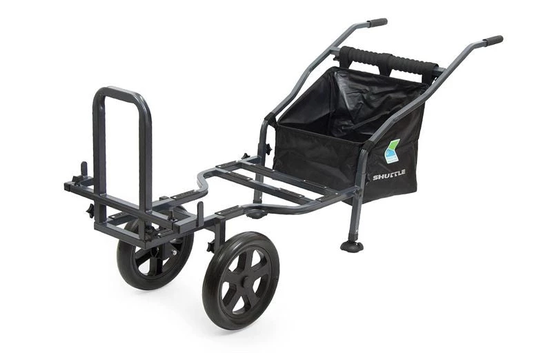 - The Space Station Shuttle is a specially designed barrow style tackle transporter, that has been developed to carry the Space Station, XBox and other seat boxes using the additional converter bar (supplied). The design also provides a large luggage loading area for carryalls and an additional removable Utility bag between the handles for clothing, pole rollers etc. In addition the Shuttle handle bar system incorporates a foam covered cross bar that can be used to support rod holdalls. Once the Shuttle is loaded, its design enables the angler to transport a complete set of tackle with ease compared to traditional seat box trolleys. This has been achieved by positioning the wheels directly beneath the heaviest part of the loaded shuttle, giving optimum balance. The Shuttle can be quickly assembled and dismantled to fit comfortably inside most car boots.