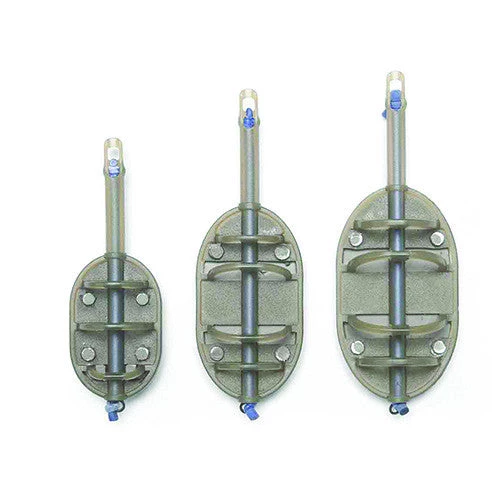 Very similar to the In-Line Flat Method Feeder in both size and construction but elasticated for shock absorbing fish-playing. The flat-bottomed design ensures they always land the correct way up with the bait at the top of the groundbait or moulded pellet ball. The light brown/translucent colour blends in with both groundbait and the bottom.